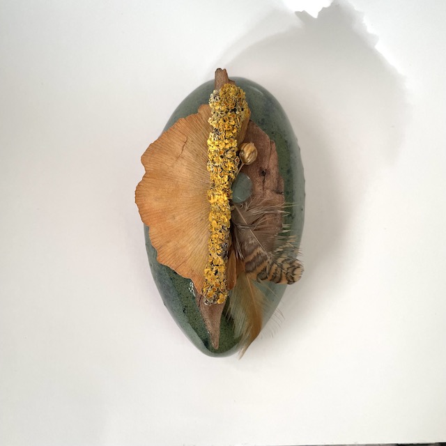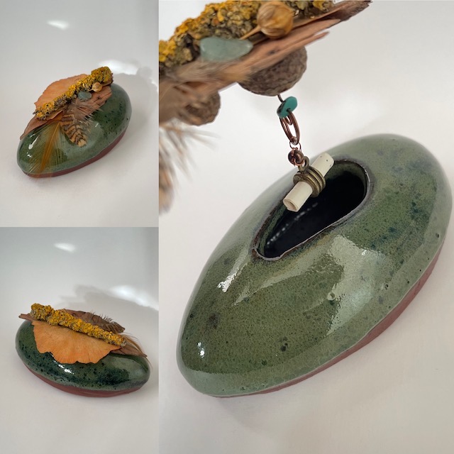 Deze Koestering is gemaakt van roodbakkende klei en heeft een donkergroene glazuur. Het heeft de vorm van een keitje. Het past mooi in de palm van je hand daardoor, waarmee je als het ware de Koestering omsluit. En dat is zo fijn! De koestering is hol om iets in te bewaren dat je dierbaar is. Er hangt een briefje in waar je iets moois op kan schrijven. De Koestering wordt gesloten door een eikeldopje, met daarbovenop Gingo bilobablad en een takje met een gele korstmos. En natuurlijk zitten er ook nog veertjes bij, die van een uiltje en van een wouw. Deze Koestering is 10 x 6 x 5 cm.