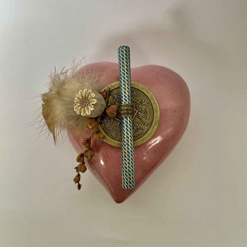 Het Koesterhartje wordt afgesloten met een grote munt met een kleine papaver, een takje van het één of ander en twee veertjes. Het ene veertje is zwart/wit gestreept. Het zou van een buizerd kunnen zijn. Het andere veertje is van een wouw. Dat vind ik een bijzondere, want die zie je hier niet heel vaak. Je kan ook iets in het hartje stoppen, het is hol van binnen. De afmeting is 9 x 8 en 7 hoog. Zoals elke Koestering past ook deze zo mooi in het kommetje van je hand.
