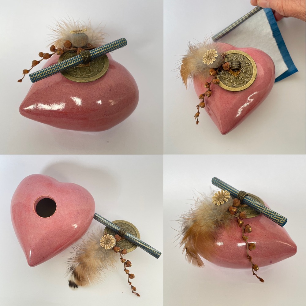 Deze roze Koestering heeft de vorm van een hartje. In het blauwe papiertje met goudkleurige patronen is een klein, wit handgeschept papiertje opgerold om een (verborgen) boodschap op te schrijven.