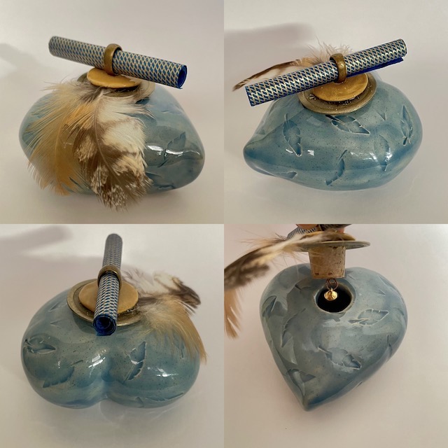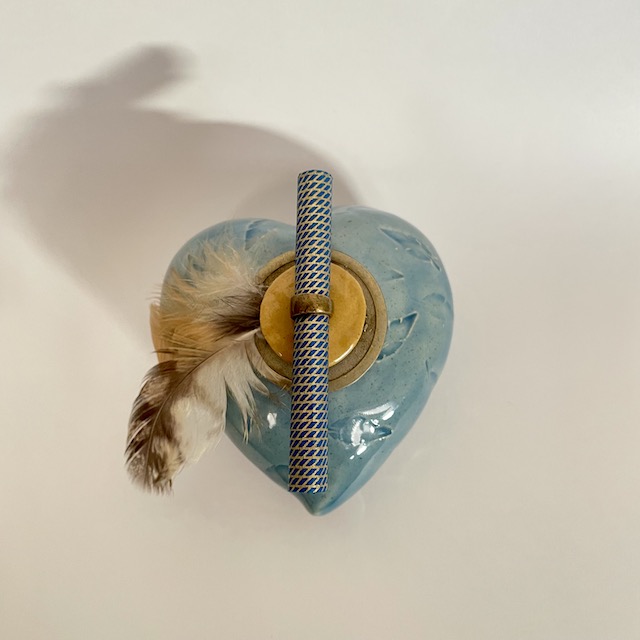 Dit veertjes-Koesterhartje is omgeven met veertjes, zowel bovenop als de imprint in de klei. Door de lichtblauwe celadon-glazuur schijnen de veertjes erdoorheen.