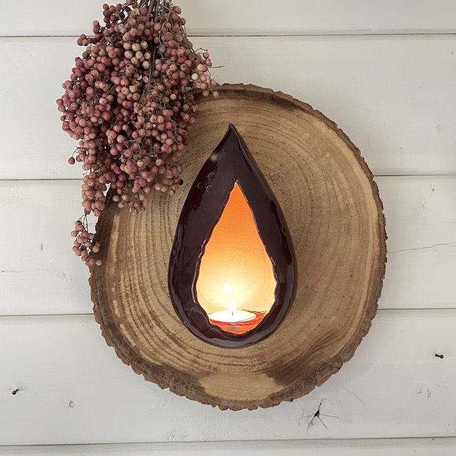 Materiaal: keramiek (witbakkende klei), klein geluksmuntje omwikkeld met donkerrood gekleurd koperdraad om een kaarsje op te zetten.
